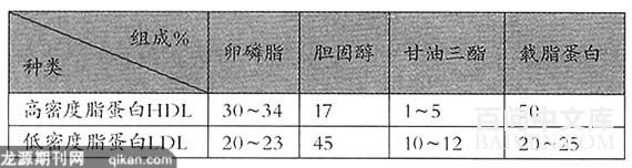 事实上,心脑血管疾病与脂肪肝、胆结石、糖尿病、高血黏(高黏滞血症)、高脂血症等现代病可谓“异病同源”—有一个共同的发病原因,即“代谢障碍综合征”。人体代谢中枢是肝脏。多种因素导致肝脏合成卵磷脂减少是“病根”。血液生化检查的项目中,高密度脂蛋白—胆固醇(HDL—c)过低,低于正常值是高脂血症的特点。高密度脂蛋白(HDL)中的32%是卵磷脂,胆固醇只占17%。“主要由卵磷脂构成的高密度脂蛋白(HDL)是净化血液、清洗血管的根本物质”这一科学结论获得了诺贝尔医学奖。请看脂蛋白的组成: