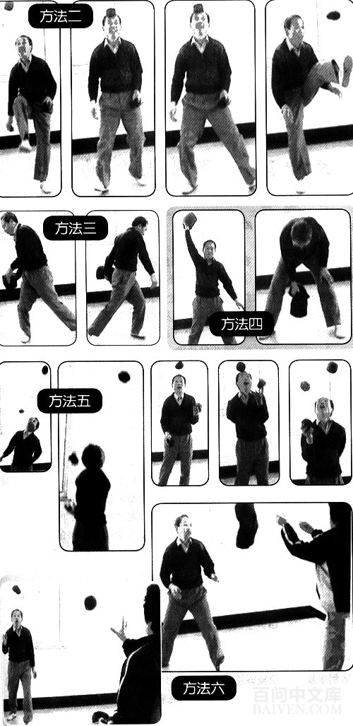 经过一段时间的各种抛接、持沙袋负重下蹲,上举、抓握等练习以后,增加了上下肢的肌肉力量,增强了心肺功能,促进了胃的蠕动,吃东西也有胃口了,腿上也有劲了,精神状态感觉非常好,上下楼梯也不感觉腿软气喘了。身体的逐步好转,使杨教授练得更认真、更带劲了,花样也在不断增加、创新,并变换了许多种玩法,有行进间的、原地的、旋转的,还创编了双人练习方法等等。杨教授的沙袋也根据身体需要,进行了改制,大的沙袋有的十几斤重,是用来练腰腿臂力的;中号的沙袋练手劲、练抛接(左右手) 玩法逐步增多;小号的几个沙袋一起练技巧性,运动全身,而且上肢、下肢、腰部非常有针对性,并且还很有意思。
