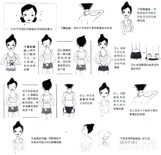 许多人微笑时在鼻子两边会产生皱纹,这种现象多是由于胸椎过于僵硬造成的,所以多多按摩胸椎对减少皱纹非常有好处。(见图⑥)