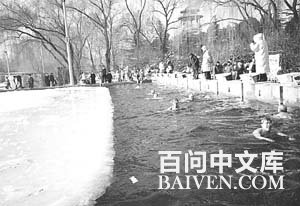 二、冬泳具有医疗功能,是一种“冷疗法”、“自然疗法”或“低温疗法”。这种疗法充分利用自然力,如冷水与空气的强冷刺激以及日光浴等自然环境。