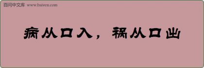 1、成语祸从口出出自晋·傅玄《口铭》:“病从口入,祸从口出。” 2、Howard听他的朋友清韵说,用“病从口入,祸从口出”造句是一件极度不轻松的事情。 3、小坏