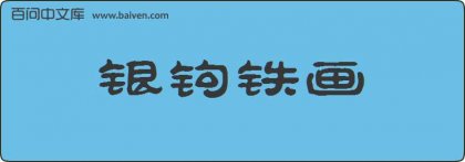 1、银钩铁画石经余,想见先唐字学书。见清·沈曾植《题北宋本广韵四绝》诗。 2、成语银钩铁画源于唐·欧阳洵《用笔论》:“徘徊俯仰,容与风流,刚则铁画,媚若