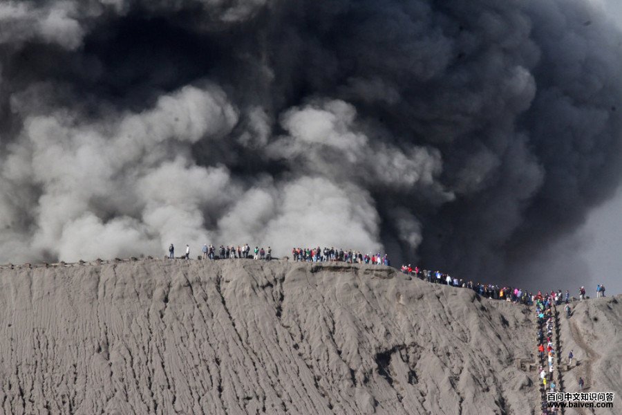 8、2016年7月,印度尼西亚婆罗摩火山喷发时,人们站在火山口边缘观看。
