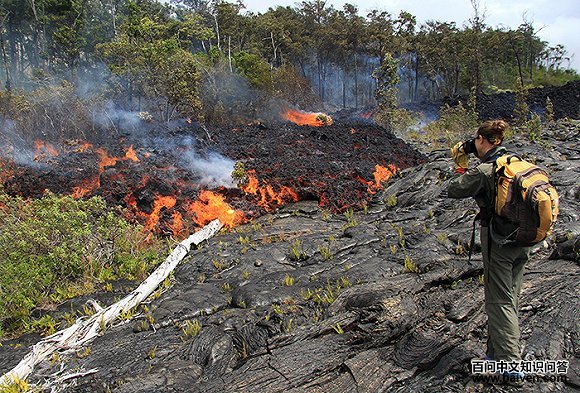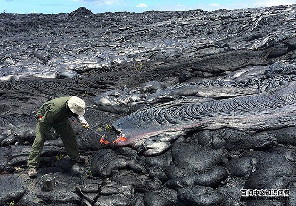 6、2016年6月23日,一名观测站的地理学家正在采集基拉韦厄火山喷发的新鲜岩浆样本,以便进行化学分析。这些样本大多来自流出的绳状熔岩(pāhoehoe)分散的边缘。