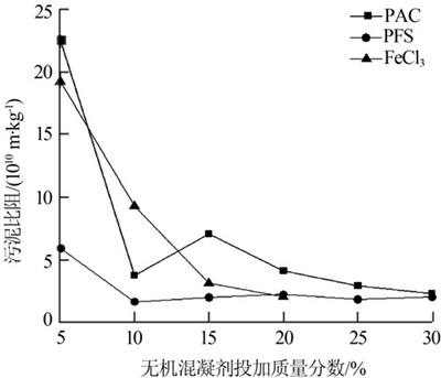 从图 1可以看出,用3种混凝剂调理污泥后,污泥的SRF均大幅降低,3种无机混凝剂对污泥的调理效果顺序为FeCl3>PFS>PAC。