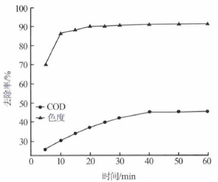 Ïò³õʼpH=3 µÄ½¹»¯Î²Ë®ÖÐͶ¼Ó1.0 g/L µÄ·ÛÄ©»îÐÔÌ¿£¬15 ¡æ½Á°è·Ö±ð¾²Ì¬Îü¸½5¡¢10¡¢15¡¢20¡¢25¡¢30¡¢40 ¡¢50¡¢60 min£¬·ÛÄ©»îÐÔÌ¿¶Ô½¹»¯Î²Ë®COD ºÍÉ«¶ÈµÄÈ¥³ýЧ¹ûÈçͼ 3 Ëùʾ¡£