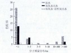 由图 4 可看出: 原水色度主要分布在表观分子质量>100 ku 和<1 ku 的溶解性有机物,主要是腐殖质和小分子难降解有机物。经过双氧水氧化降解后, 5~100 ku 之间的色度明显被降解,产生了许多小分子有色溶解性有机物,导致1~5 ku 之间的色度有所增加,<1 ku 的色度也去除明显。经过活性炭脱色后,3 ku 以下的色度也得到有效去除。
