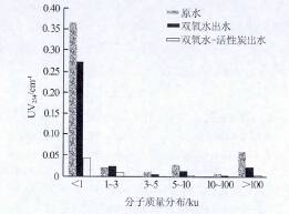 UV254 的分子质量分布见图 5。图 5 可以看出,原水的UV254 主要分布在表观分子质量<1ku 区间,占总溶解性有机物UV254 的73.90%。双氧水对各个分子质量区间的UV254 都有降解,但分子质量在1~ 3 ku 范围的UV254 有少量增加,<1 ku 区间降解不明显。经过活性炭处理后,各个区间都得到明显降低。