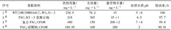 从表1 中可看出,各种配方处理不同性质的含油污水,除油率、悬浮物去除率能达到90% 以上。每一种复配效果与单独使用无机絮凝剂的相比[5-8],复合使用可以降低药剂用量,降低成本。