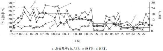 ABR是利用微生物生长吸收去除氮,因为厌氧微生物生长缓慢,因此依靠此途径去除的氮量较少. SSFW对氮的去除途径是多样的,包括植物摄取、基质截留、挥发和微生物作用[9],系统对TN的去除主要靠SSFW 来完成.