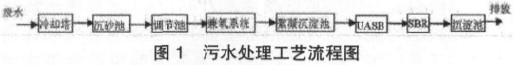 废水经冷却塔、沉砂池,进入调节池调节水质后进入兼氧处理系统,出水进入絮凝沉淀池,由污水泵提升进入UASB 厌氧装置,UASB 处理后废水中大部分有机物得到有效的去除;厌氧出水,然后由泵提升至SBR 装置,再进行沉淀后废水达标排放。工艺流程见图1。