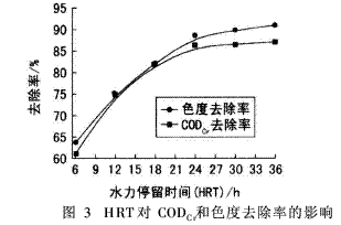 改变水力停留时间(HRT),测量HRT对CODCr和色度去除效果的影响[5],结果如图3所示。