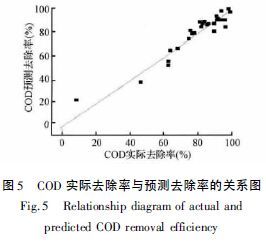 ͼ5 Ϊ·ÏË®COD È¥³ýÂʵÄʵ²âÖµÓëÔ¤²âÖµ¹ØÏµÍ¼¡£ÓÉͼ¿É¼û£¬ÊµÑéÊý¾Ýµã»ù±¾·Ö²¼ÔÚÖ±ÏßÉÏ£¬Éî¶È´¦ÀíºóÁ¶ÓÍ·ÏË®COD È¥³ýÂʵÄʵ¼ÊÖµºÍÔ¤²âÖµµÄƤ¶ûÑ·Ïà¹ØÏµÊý(pearson correlation coefficient)Ϊ0£®981£¬ËµÃ÷Ä£ÐÍÔ¤²âÖµÓëʵ²âÖµÖ®¼ä´æÔÚÁ¼ºÃµÄÏßÐÔ¹ØÏµ£¬Ä£Ð;ßÓнϸߵÄ׼ȷ¶È¡£