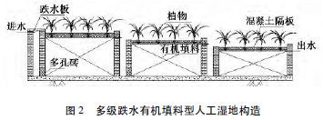 ¶à¼¶µøË®ÓлúÌîÁÏÐÍÈ˹¤ÊªµØ¹²·Ö4 ¼¶£¬ÎÛË®ÓɱôÓÑáÑõ³ØÌáÉýÖÁ²¼Ë®Çø£¬½øÈëµÚÒ»¼¶µøË®³äÑõµ¼Á÷²ÛºóÔÙµ¼Èë¸Ã¼¶È˹¤ÊªµØ£¬×Ô϶øÉÏÁ÷ÈëµÚ¶þ¼¶µøË®³äÑõµ¼Á÷²Ûºóµ¼ÈëµÚ¶þ¼¶È˹¤ÊªµØ£¬Èç´ËÑ»·Íù¸´ºó×îÖÕÓɼ¯Ë®ÇøÅųö¡£È˹¤ÊªµØÓÉ»ìÄýÍÁ¸ô°å·ÖΪÉÏÏÂÁ½²¿·Ö£¬Éϲ¿ÓÉÖ²ÎïÔÔÖ²²ã¡¢5 cmºñÁ£¾¶0. 005 ¡«0. 01 m ϸʯ×Ó²ãºÍ15 cmºñÁ£¾¶0. 03¡«0. 05 m ¼ÓÆø»ìÄýÍÁÆö¿é²ã×é³É£¬Ï²¿ÎªÓлúÌîÁϲ㡣ÎÛË®Ë®Ãæ¿ØÖÆÔÚ¼ÓÆø»ìÄýÍÁÆö¿é²ãÉ϶ˣ¬ÔÔÖÖÖ²ÎïΪÃÀÈ˽¶¡£¹¹ÔìÈçͼ2 Ëùʾ¡£
