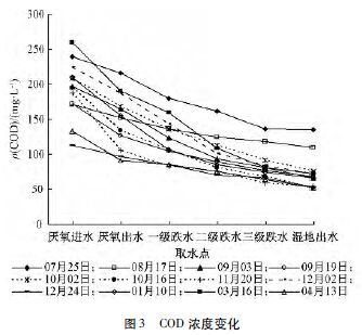 1) ½øË®¦Ñ(COD) ²¨¶¯½Ï´ó£¬×î¸ß¿É´ï260 mg/L£¬×îµÍΪ113 mg/L¡£ÕûÌåÀ´¿´£¬×ÔÑáÑõ³Ø½øË®ÖÁʪµØ³öË®£¬COD Ũ¶È³ÊÖð½¥½µµÍÇ÷ÊÆ£¬ÓÈÆäÊÇÔÚ¶þ¼¶µøË®Ç°£¬COD Ũ¶È½µ·ù½Ï´ó¡£Ëæ×ż¾½Ú±ä»¯£¬COD È¥³ýÂÊÃ÷ÏÔÌáÉý£¬Ò»°ã¾ù±£³ÖÔÚ60%ÒÔÉÏ£¬×î¸ß¿É´ï73. 3%¡£¡£