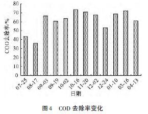 ´Óͼ4 ¿ÉÒÔ¿´³ö: ʪµØ¿ªÊ¼ÔËתµÄǰ2 ´ÎÈ¥³ýЧÂʽϵͣ¬´ËʱÑáÑõ³Ø¼°ÊªµØÄÚÌîÁÏÉÐδ¹ÒĤ£¬Ö²ÎïûÓÐÍêÈ«¸´ËÕÉú³¤£¬¸ùϵ²»·¢´ï£¬´Ó¶øµ¼ÖÂÈ¥³ýÂʽϵ͡£Ëæ×ż¾½Ú±ä»¯£¬COD È¥³ýÂÊÃ÷ÏÔÌá¸ß£¬Ò»°ã¾ù±£³ÖÔÚ60%ÒÔÉÏ£¬×î¸ß¿É´ï73. 3%£¬¼´Ê¹¶¬¼¾COD È¥³ýÂÊÒ²ÄÜά³Ö½Ï¸ßˮƽ(³öË®¦Ñ(COD) = 61 mg/L) £¬±íÃ÷¾¡¹Ü¶¬¼¾ÆøÎ½ϵͣ¬Î¢ÉúÎï»î¶¯¼õÈõ£¬µ«Ò»·½ÃæµøË®µÄÉè¼ÆÔö¼ÓÁËÎÛË®ÖÐÈܽâÑõŨ¶È£¬ÁíÒ»·½Ã浯ÐÔÌîÁÏÈ¡´úʯ×Ó¡¢»ÆÉ³µÈ´«Í³ÌîÁÏÒ²´ó´óÔö¼ÓÁËʪµØÄÚ²¿Î¢ÉúÎïÊýÁ¿£¬Òò´Ë£¬ÔÚ¶¬¼¾ÈÔ±íÏÖ³ö½Ï¸ßµÄCOD È¥³ýЧÂÊ¡£
