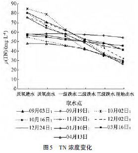 ÓÉͼ5 µÄ¼ì²â½á¹û¿´£¬½øË®TN Ũ¶È×Ô¼ì²â¿ªÊ¼ÖÁ2012 Äê12ÔÂ2 ÈÕ£¬TN Ũ¶ÈÃ÷ÏÔÆ«¸ß£¬ÔÚ5 ´Î¼ì²âÖÐ4´Î¾ùÔÚ75 mg/L ÒÔÉÏ; 2012 Äê12ÔÂ2 Èպ󣬽øË®TN Ũ¶ÈÃ÷ÏÔ½µµÍ£¬Î¬³ÖÔÚ48. 3¡«58. 2 mg/L£¬·ÖÎöÈÏΪ¿ÉÄÜÓë¾ÓÃñÓÃË®Á¿¼õÉÙÓйء£³öË®TN Ũ¶È³ý2012 Äê9ÔÂ19 ÈÕ¡ª11ÔÂ20 ÈÕ4 ´Îά³ÖÔÚ30 mg/L ÒÔÏÂÍ⣬ÆäÓà6´ÎÈ«²¿³¬¹ý30 mg/L£¬×î¸ß´ï54. 3 mg/L£¬³öˮŨ¶ÈÆ«¸ß¡£·ÖÎöÈÏΪ¿ÉÄÜÓÉÓÚµøË®µ¼ÖÂʪµØÄÚ²¿ÈܽâÑõ½ÏΪ³ä×㣬ÎÞ·¨ÐγÉÑáÑõ»·¾³µ¼Ö²¿·ÖNO3--N ÎÞ·¨»¹Ô£¬´Ó2013 Äê1ÔÂ10 Èյļì²âÊý¾ÝÖпÉÒÔ¿´³ö£¬NO3--NŨ¶È´ÓʪµØ½øË®µ½³öË®²»½µ·´Éý¡£
