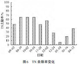 ÓÉͼ6 ¿É¼û: 9¡ª12Ô³õ£¬¾¡¹Ü½øË®TN Ũ¶È½Ï¸ß£¬µ«È¥³ýÂʾùÔÚ50% ÒÔÉÏ£¬ÆäÖÐ×î¸ß¿É´ï65. 3%¡£¶¬¼¾ºÍÔç´º£¬¾¡¹Ü½øË®ÖÐTN Ũ¶È½ÏµÍ£¬µ«È¥³ýЧÂÊÕûÌ寫µÍ£¬ÆäÖУ¬×îµÍ³öÏÖÔÚ2013 Äê1ÔÂ10 ÈÕ£¬TNÈ¥³ýÂʽöΪ6. 1%¡£·ÖÎöÈÏΪ£¬12Ô³õ֮ǰ£¬Ò»·½ÃæÆøÎÂÕûÌ寫¸ß£¬ÎÞÂÛÊÇÑáÑõ¾ú»òºÃÑõ¾úȺÊýÁ¿¶à£¬»îÐԸߣ¬Ïõ»¯·´Ïõ»¯½ÏΪ³ä·Ö; ÁíÒ»·½Ã棬ֲÎïÕý´¦³ÉÊìÆÚ£¬¶ÔµªËØÎüÊÕÄÜÁ¦½ÏÇ¿¡£12Ô³õÖ®ºó£¬Î¢ÉúÎï»îÐÔ¼°ÊýÁ¿´ó´ó½µµÍ£¬Í¬Ê±Ö²ÎïÒ²ÒÑ¿Ýή£¬Òò´ËÈ¥³ýÂÊÏàÓ¦½µµÍ¡£