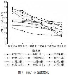 ÓÉͼ7 ¿ÉÖª: ¦Ñ(NH4+-N) ½øË®Îª35¡«70 mg/L£¬²¨¶¯½Ï´ó£¬Æ½¾ùŨ¶ÈÔ¼52. 3 mg/L¡£ÕûÌåÀ´¿´£¬NH4+-NŨ¶ÈÖð½¥½µµÍ£¬³öˮŨ¶Èά³ÖÔÚ13. 7¡«40. 0 mg/L£¬Æä±ä»¯Çé¿öÓëTN ÀàËÆ£¬2012 Äê12ÔÂ2 ÈÕǰ£¬½µ·ù½ÏΪÃ÷ÏÔ£¬12ÔÂ2 ÈÕºó½µ·ù½ÏС¡£ÁíÍ⣬´ÓʪµØµøË®Ð§¹ûÀ´¿´£¬Ã¿¼¶µøË®ÆØÆø¶Ô°±µªÅ¨¶È½µµÍЧ¹ûÏ൱£¬³ä·Ö˵Ã÷µøË®¶Ô°±µªÏõ»¯×÷ÓÃÃ÷ÏÔ¡£