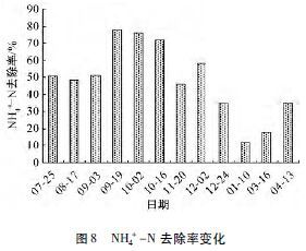 ÓÉͼ8 ¿ÉÖª£¬7¡ª11ÔÂNH4+-N È¥³ýÂʽϸߣ¬×î¸ßÖµ³öÏÖÔÚ9Ô·ݣ¬´ï77. 9%; ¶¬¼¾ºÍÔç´º£¬È¥³ýЧÂÊÕûÌ寫µÍ£¬×îµÍ³öÏÖÔÚ1Ô·ݣ¬½öΪ11. 7%¡£·ÖÎöÈÏΪ¸ÃÇé¿ö¿ÉÄÜÓë΢ÉúÎï»îÐÔ¼°Ö²Îï¡¢ÌîÁÏÎü¸½ÎüÊÕÓйأ¬12Ô³õ֮ǰ£¬ÆøÎ¸ߣ¬Ïõ»¯¾úÊýÁ¿¶à£¬»îÐÔÇ¿£¬Ïõ»¯·´Ó¦³ä·Ö£¬ÕâµãÒ²¿É´Óͼ9 ¿´³ö¡£12Ô³õÖ®ºó£¬Ëæ×ÅÆøÎ½µµÍ¼°Ö²Îï¿Ýή£¬Î¢ÉúÎï½µ½â¼°Ö²ÎïÎüÊÕ×÷ÓÃÏàÓ¦¼õÈõ£¬³öˮŨ¶ÈÆ«¸ß£¬È¥³ýÂʽµµÍ¡£
