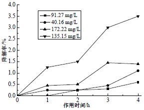 ÅäÖÆ³õʼŨ¶È·Ö±ðΪ40.16 mg/L£¬91.27 mg/L£¬135.15 mg/L£¬172.22 mg/LµÄ±½·Ó·´Ó¦Òº¸÷200 mL£¬ÔÚpHΪ7£¬Î¶ÈΪ30 ¡æÌõ¼þÏÂÓó¬Éù²¨·øÕÕ4 h£¬²»Í¬³õʼŨ¶ÈµÄ±½·ÓµÄ³¬Éù½µ½âЧ¹ûÈçͼ1Ëùʾ¡£