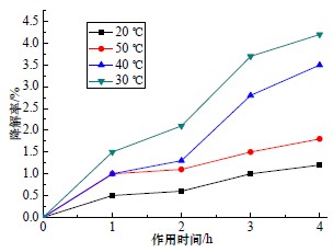 ÅäÖÆ³õʼŨ¶ÈΪ135 mg/L£¬pHΪ7µÄ±½·ÓÈÜÒº¸÷200 mL£¬·Ö±ðÔÚ20 ¡æ£¬30 ¡æ£¬40 ¡æºÍ50 ¡æÌõ¼þÏÂÓó¬Éù²¨·øÕÕ4 h£¬²»Í¬Î¶ȶԱ½·ÓµÄ½µ½âЧ¹ûÈçͼ2Ëùʾ¡£