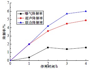 ÓÉͼ3¿ÉÖª£¬µ¥¶ÀÆØÆøÊ±±½·ÓµÄ½µ½âÂʽöÓÐ1.58 %£»µ¥¶À³¬Éù²¨·øÕÕʱ±½·ÓµÄ½µ½âÂÊΪ5.64 %£»Í¬Ê±ÆØÆøºÍ³¬Éùʱ±½·ÓµÄ½µ½âÂÊΪ6.78 %£¬±ÈÁ½ÕßÖÐÈκÎÒ»¸öÒòËØµ¥¶À×÷ÓÃʱµÄЧ¹û¶¼Òª¸ß¡£ÕâÊÇÒòΪÔÚ³¬Éù·øÕÕ±½·ÓË®ÈÜÒºµÄ¹ý³ÌÖÐͬʱͨÈë¿ÕÆøºó£¬Ë®ÖвúÉúµÄ¡¤OH×ÔÓÉ»ùµÄÁ¿Ôö¼Ó£¬´Ó¶øÊ¹±½·ÓºÍ¡¤OH×ÔÓÉ»ù·´Ó¦¼¸ÂÊÔö´ó¡£