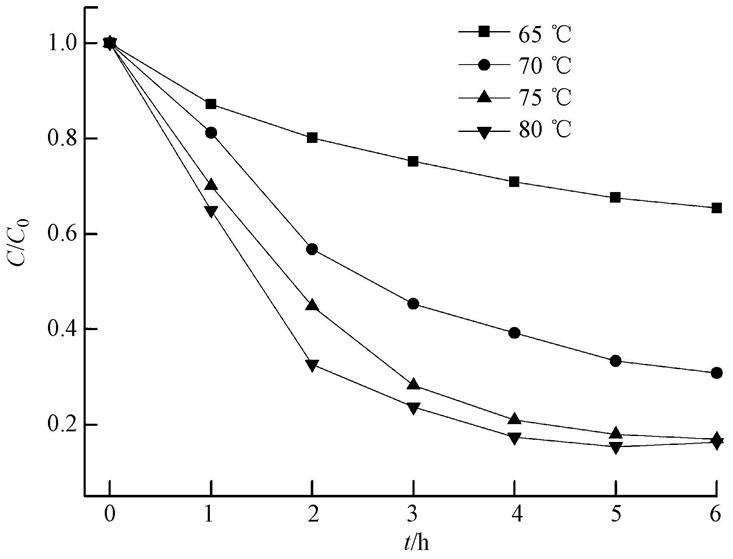 ¡¡¡¡Î¶ÈÊÇÓ°ÏìPS»î»¯Ñõ»¯ÓлúÎïµÄÒ»¸öÖØÒªÒòËØ£¬Î¶ȶÔPSÑõ»¯ROCÖÐÓлúÎïµÄÓ°ÏìЧ¹û¼ûͼ 3£¬ÔÚ×îÊÊÒ˵ÄpHºÍ³õʼPSŨ¶ÈÌõ¼þÏ£¬Ñ¡ÔñζÈ65¡«80 ¡æ½øÐл.ÔÚ4 hµÄ·´Ó¦Ê±¼äÄÚ£¬ROCµÄCODÔÚ65¡¢70¡¢75ºÍ80 ¡æÌõ¼þÏ´Ó112 mg ¡¤ L-1·Ö±ð½µµÍµ½84.7¡¢42.5¡¢21.5ºÍ19.8 mg ¡¤ L-1£¬±íÃ÷ROCµÄÓлúÎïÈ¥³ýЧÂÊËæ·´Ó¦Î¶ȵÄÔö¼Ó¶øÔö¼Ó(p<0.05).ζÈÓÉ75 ¡æÔö¼Óµ½80 ¡æÊ±£¬ROCµÄCODÔÚ·´Ó¦µÄ4¡«6 hÄÚ£¬COD±ä»¯²»´ó(p>0.05)£¬±íÃ÷ÔÚ´Ë·´Ó¦ÌåϵÄÚ£¬75 ¡æÎ¶ȿÉÒÔ¿ìËٻPS£¬¿¼Âǵ½¾¼Ã³É±¾£¬È·¶¨±¾Ñо¿µÄÊÊÒ˵ĻζÈΪ75 ¡æ.