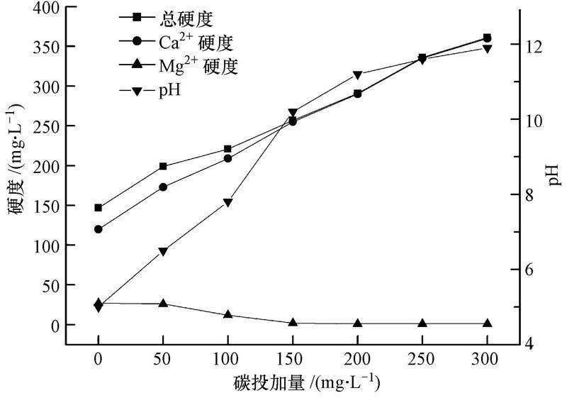 ¡¡¡¡ÓÉÓÚMg(OH)2µÄKsp(1.8¡Á10-11)±ÈCa(OH)2µÄKsp(5.5¡Á10-6)С5¸öÊýÁ¿¼¶£¬Ê¯»ÒͶ¼ÓÈëÈÜÒºÖÐÒÔºó£¬Éú³É¸üÄÑÈܵÄMg(OH)2³ÁµíʹÈÜÒºÖеÄþÀë×ӵõ½È¥³ý(²ÌÃ÷Õеȣ¬2009).ÈÜÒºÖеÄ×ÜÓ²¶È¡¢¸ÆÓ²¶È¡¢Ã¾Ó²¶ÈºÍpHËæÊ¯»ÒͶ¼ÓÁ¿µÄ±ä»¯¼ûͼ 4.×ÜÓ²¶È¡¢¸ÆÓ²¶ÈºÍÈÜÒºµÄpHËæÊ¯»ÒͶ¼ÓÁ¿µÄÔö¼Ó²»¶ÏÔö¼Ó£¬Ïà·´µØ£¬Ã¾Ó²¶ÈÈ´ÔÚ²»¶Ï½µµÍ.µ±Ê¯»ÒµÄͶ¼ÓÁ¿Ôö¼Óµ½150 mg ¡¤ L-1ʱ£¬ÈÜÒºµÄpH´ïµ½10.2£¬Ã¾Ó²¶È½µµÍµ½1.2 mg ¡¤ L-1£¬¼ÌÐøÍ¶¼Óʯ»Ò£¬Ã¾Ó²¶È±ä»¯²»´ó(p>0.05)£¬±íÃ÷ʯ»ÒͶ¼ÓÁ¿ÒÑÂú×ãÈÜÒºÖÐMg2+µÄÈ¥³ý£¬È·¶¨´Ë·´Ó¦ÌåϵÊÊÒ˵Äʯ»ÒͶ¼ÓÁ¿Îª150 mg ¡¤ L-1.