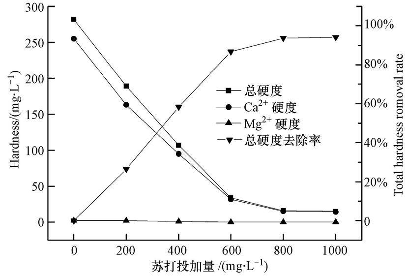 ¡¡¡¡ËÕ´ò¼´ÎÞË®Na2CO3£¬ËÕ´ò¿ÉÒÔºÍÈÜÒºÖеÄCa2+½áºÏÉú³ÉÄÑÈܵİ×É«³Áµí̼Ëá¸Æ£¬Ì¼Ëá¸ÆµÄKsp½öΪ4.8¡Á10-9£¬¿ÉÒÔÓÐЧ½µµÍÈÜÒºÖеÄCa2+Ó²¶È.ROCŨˮÖÐ×ÜÓ²¶È¡¢Ca2+Ó²¶È¡¢Mg2+Ó²¶ÈºÍ×ÜÓ²¶ÈÈ¥³ýÂÊËæËÕ´òͶ¼ÓÁ¿Ôö¼ÓµÄ±ä»¯¼ûͼ 6.ÓÉͼ 6¿ÉÖª£¬ËÕ´òͶ¼ÓÁ¿´Ó0 mg ¡¤ L-1Ôö¼Óµ½800 mg ¡¤ L-1ʱ£¬×ÜÓ²¶ÈºÍCa2+Ó²¶È¼±¾çϽµÖÁ16.5 mg ¡¤ L-1£¬×ÜÓ²¶ÈÈ¥³ýÂÊ´ïµ½83.6%£¬ËÕ´òͶ¼ÓÁ¿¼ÌÐøÔö¼Ó£¬×ÜÓ²¶ÈºÍCa2+Ó²¶È±ä»¯²»´ó(p>0.05).ÓÉÓÚӡȾÓÃË®±ê×¼Ã÷È·¹æ¶¨»ØÓÃË®µÄ×ÜÓ²¶ÈСÓÚ17.5 mg ¡¤ L-1(´Þ¼Òç÷£¬2013)£¬È·¶¨ÊÊÒ˵ÄËÕ´òͶ¼ÓÁ¿Îª800 mg ¡¤ L-1.