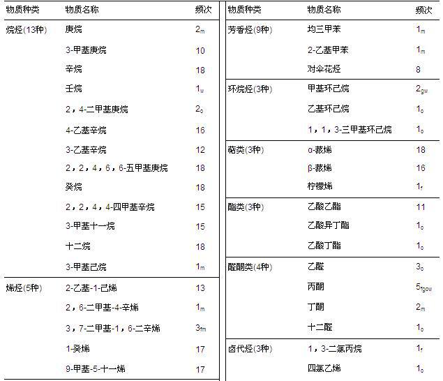 限于条件,本研究存在一些不足:①以总频次85%作为高频次物质和低频次物质的界限具有主观性;②臭气强度确定仅采用了计算方法,没有结合嗅辨员实际测定.