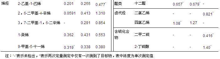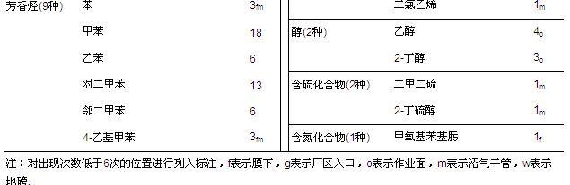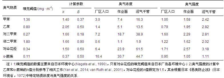 表6 可能的恶臭物质的臭气浓度和臭气强度