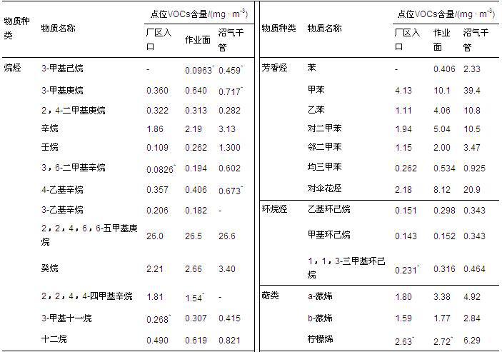 所测得的物质浓度均处于0.05~40 mg · m-3之间,而且除2,2,4,6,6-五甲基庚烷和沼气干管填埋气内的部分成分之外,其他物质的浓度基本处于0.1~10 mg · m-3之间.在厂区入口和作业面浓度最高的物质均是2,2,4,6,6-五甲基庚烷,在沼气干管浓度最高的物质为甲苯.烷烃中浓度高的有2,2,4,6,6-五甲基庚烷、辛烷、癸烷和2,2,4,4-四甲基辛烷,在3个点位均达到1 mg · m-3以上.芳香烃和萜类化合物整体处于高浓度水准,除苯和均三甲苯之外在各点位浓度均在1 mg · m-3以上.此外,四氯乙烯在厂区入口和作业面均超过1 mg · m-3,2,6-二甲基-4-辛烯和2-丁硫醇在沼气干管浓度超过1 mg · m-3,属于高浓度化合物.