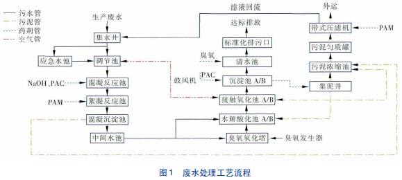 针对天津某制药厂废水悬浮物浓度高、全盐量高、B/C 值低、pH 值变化范围广等特点,采用了混凝沉淀/臭氧/接触氧化的组合处理工艺,出水各项指标达到或优于天津市《污水综合排放标准》(DB 12/356—2008) 的三级标准后排放。设计进、出水水质见表1。