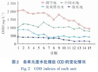 系统稳定运行后连续监测1 个月,各处理单元的COD 值变化情况见图2。