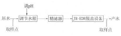 原水即污水处理厂出水首先进入调节水箱内,由于原水的总硬度较高,需要在调节水箱中投加少量的盐酸调节pH,防止结垢性离子结晶析出污堵膜脱盐设备。调节水箱出水由泵增压(0.2 MPa)进入精滤器过滤(5 μm),以防止颗粒物质对电渗析设备膜片的影响。精滤器出水进入JR-EDR 电渗析脱盐设备进行脱盐,该设备为北京京润新技术发展有限责任公司的专利技术,具有对进水水质要求宽泛、抗污染性强、设备投资低、回水率高等特点,脱盐设备产水即为最终产水。工艺前后分别设1 个取样点,定时取样检测。