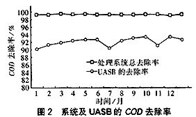 几个月的运行表明,整个废水处理系统对COD的去除率较高(99%以上),同时具有较高的耐冲击能力。