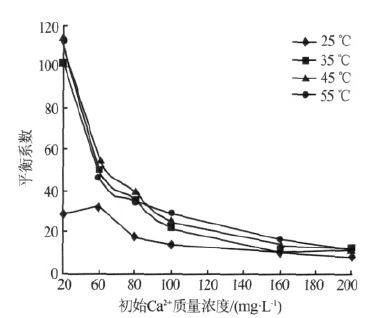 由图 6 可知,在同一Ca2+初始浓度下随着温度升高,平衡系数增大,特别是25~35 ℃,平衡系数大幅增加,表明随着反应温度的增加,螯合树脂对Ca2+的选择性提高,有利于废水中Ca2+的选择性去除。。
