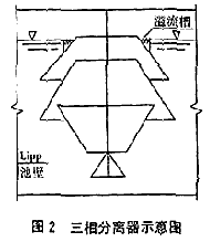 ①由于废水处理设施正好位于原有的池塘上,其地基承载力和土质均匀度都很差,如采用钢筋混凝土结构,由于其自重大,地基处理费用就相当高。厌氧罐和贮气柜设计采用德国引进的Lipp罐体,由于罐体自重轻,基础比较容易处理,费用随之降低。厌氧消化罐高为9 m,直径为7 m,是地上式圆形Lipp罐。由于对厌氧消化罐的径、高比进行了调整,原有的三相分离器就不是很适合。因此,对三相分离器进行了重新设计,采用三层钢结构漏斗式导流板做三相分离器(见图2)。从使用结果看,三相分离效果相当好,厌氧污泥流失量很小,污泥截留效果明显。