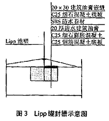 ③厌氧消化罐采用Lipp技术进行卷制。筒体材料采用不锈钢复合高强度板卷制,在罐顶上部安装有压顶槽钢,采用不锈钢螺栓与筒体之间的定位,不采用焊接方式。筒体制作完成后,进行罐内的金属结构安装。由于罐体为金属结构,罐顶可在罐内金属结构完成后再进行安装,这样给罐内的安装工作带来了极大的便利。厌氧罐内设有布水器,布水器采用枝状布水,隔3m2设有一个布水头,布水较为均匀。三相分离器的安装是罐内金属结构安装的重点,由三个圆锥形正反斗组成,施工要求高、难度大。在施工中充分利用罐顶后施工的特点,三个圆锥斗在外进行拼接,然后到罐内进行安装,降低了施工难度和劳动强度,工程质量也较容易控制,加快了工程进度。安装完成三相分离器和溢流槽后,进行罐顶的安装施工工作。罐体保温材料采用阻燃型的聚苯乙烯泡沫板,外壳采用彩色瓦楞钢板,瓦楞钢板采用特制的定位卡头扁钢定位,安装效果良好。Lipp罐体与钢筋混凝土之间的浇筑采用膨胀混凝土(见图3)。