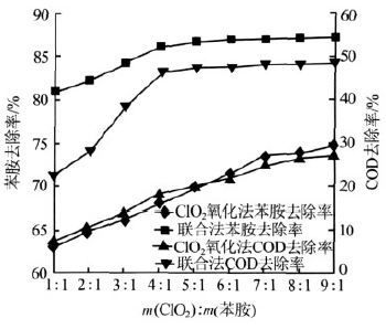 在废水初始pH 条件下,我们分别采用ClO2氧化-光催化联合处理法与单独ClO2氧化法对苯胺废水进行处理,得到两种处理方法的处理效果见图 2。