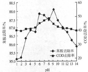 考察了反应pH 对苯胺去除率和COD 去除率的影响,结果见图 3。