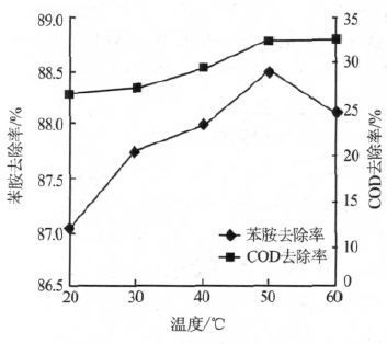 图 4 反应温度对苯胺和COD 去除率的影响