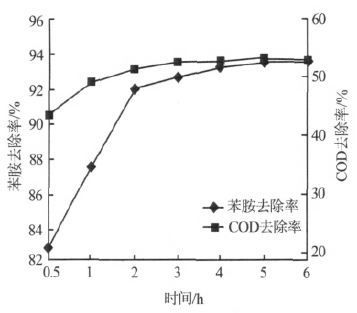 (2)苯胺废水的pH 对处理效果有影响,当pH为6~10 时,可以达到较优处理效果;反应温度对处理效果影响不大;反应时间为4 h,反应体系的COD去除率趋于平衡。