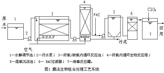 采用水解酸化—到置的膜微孔曝气生物接触氧化A/O工艺—膜微孔曝气生物接触氧化塔—混凝沉淀—过滤—消毒处理工艺集成系统处理含甲醇工业废水,在原水水质为含甲醇0.03%~5%,pH 6~10, SS为30~100mg/l, CODcr为200~500 mg/l条件下,处理系统出水达冷却塔循环用水要求。