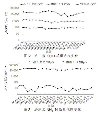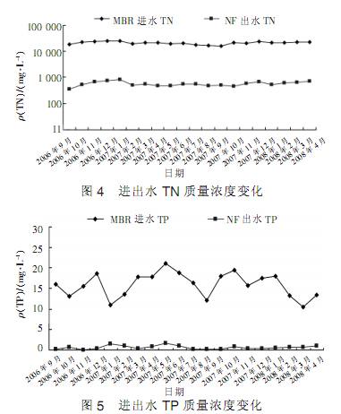 BRϵͳ³öË®µÄCODÖÊÁ¿Å¨¶ÈÒ»Ö±ÔÚ1500mg/LÒÔÏ£¬¶øÔËÐкóÆÚ³öË®ÔòÎȶ¨ÔÚ1000mg/LÒÔÏ¡£Õû¸öÔËÐÐÆÚ¼äMBRµÄƽ¾ù³öË®CODÖÊÁ¿Å¨¶ÈΪ945mg/L£¬Æ½¾ùCODÈ¥³ýÂÊΪ94.6%¡£NFϵͳÎȶ¨ÔËÐкó³öË®¾ùÄܱ£³ÖÔÚ100mg/LÒÔÏ£¬¾ùֵΪ80mg/L£¬NFƽ¾ùCODÈ¥³ýÂÊ´ï91.5%¡£ÏµÍ³×ÜÌåCODÈ¥³ýÂÊ´ï99.5%¡£NH3£NµÄ¾»»¯Ö÷Ҫͨ¹ýMBRµÄÉú»¯¾»»¯¹ý³ÌÀ´ÊµÏÖ£¬ÓÉÓÚMBRÄܹ»½ØÁôÔöÖ³»ºÂýµÄÏõ»¯Ï¸¾ú£¬´ó´óÌá¸ßÁËϵͳµÄÏõ»¯ÄÜÁ¦£¬MBR³öË®NH3£NÖÊÁ¿Å¨¶Èƽ¾ùΪ6.9mg/L£¬ÒÑ´ïµ½ÁËÅŷűê×¼¡£Éú»¯¹ý³ÌµÄNH3-NÈ¥³ýÂʸߴï99.5%¡£NF³öË®TNºÍTPÖÊÁ¿Å¨¶Èƽ¾ùΪ57mg/LºÍ0.5mg/L£¬´ïµ½ÁËÅŷűê×¼¡£
