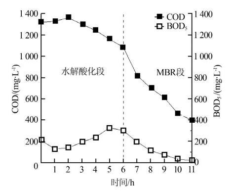 ½Íĸ¾úÔ¤´¦Àí³öË®ÓÉË®½âËữ¡ªÄ¤ÉúÎï·´Ó¦Æ÷½øÐд¦Àí£¬ÆäCOD¼°BOD5±ä»¯Çé¿öÈçͼ 6Ëùʾ¡£
