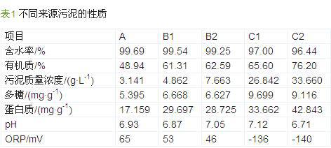 ѡȡÁË5ÖÖ²»Í¬À´Ô´µÄÎÛÄà£ºÆØÆø³ØÎÛÄàA²É×ÔÉϺ£»ª¶«Àí¹¤´óѧÎÛË®´¦ÀíÕ¾£¬¸Ã´¦ÀíÕ¾²ÉÓÃSBR¹¤ÒÕ£¬ÔÚÆØÆø½×¶ÎÈ¡Ñù£»¶þ³Á³ØÎÛÄàB1¡¢B2·Ö±ð²É×ÔÉϺ£ËɽijÎÛË®´¦Àí³§¡¢ÉϺ£Ðì»ãijÎÛË®´¦Àí³§£¬Á½´¦Àí³§¾ùΪA/A/O¹¤ÒÕ£»Å¨Ëõ³ØÎÛÄàC1¡¢C2ͬÑù²É×ÔÉÏÊöÁ½ÎÛË®´¦Àí³§¡£²»Í¬À´Ô´ÎÛÄàµÄÐÔÖʼû±í 1¡£