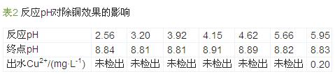 向废水中加入FeSO4·7H2O,使废水中的Fe2+为320 mg/L,控制终点pH在8.8左右,快搅1 min,搅拌速度为120~140 r/min,然后静置酸化15 min,考察反应pH对Cu2+去除效果的影响,如表2所示。