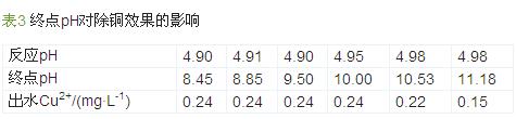 在Fe2+质量浓度为320 mg/L、快搅1 min、酸化15 min条件下,控制反应pH在5.0左右,考察终点pH对Cu2+去除效果的影响,如表 3所示。